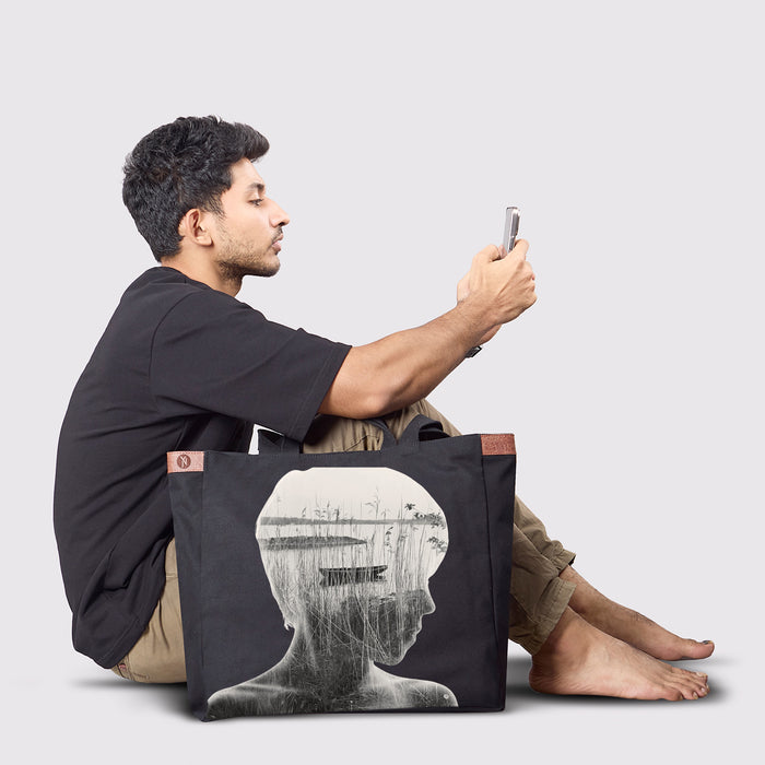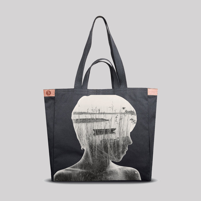 Drift carries more than things. It carries your day. A large tote in 100% cotton canvas with coconut-based leather trim and cotton fabric lining. The main compartment secures with a magnet lock; inside, a zipped section keeps order with two open pockets stitched onto it. Structured yet fluid, Drift contains your chaos with intent.