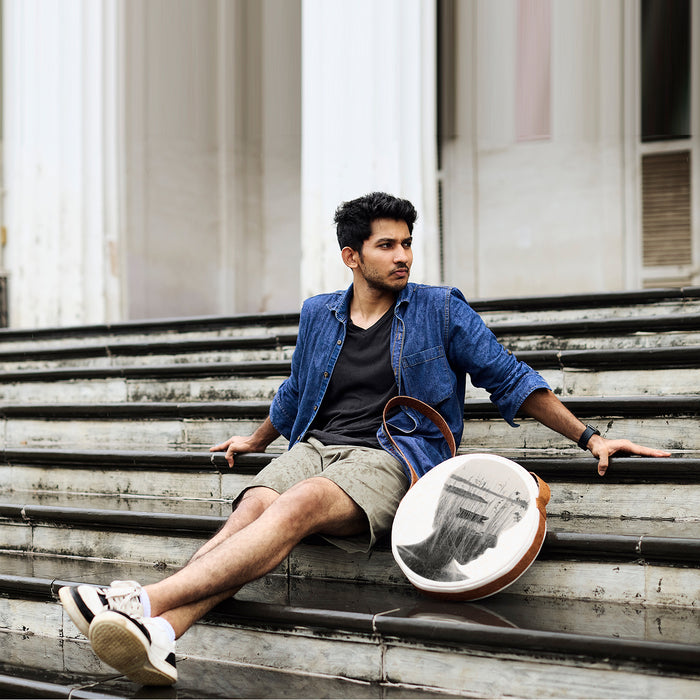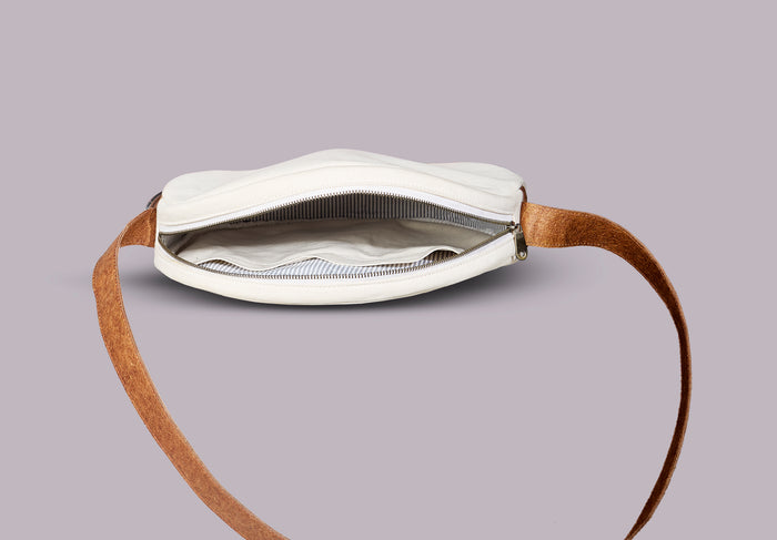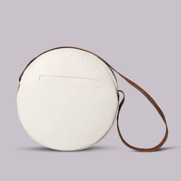 Orb is circular, sculptural, unapologetically present. 14-inch diameter in 100% cotton canvas, finished with coconut-based leather trim and handle. Inside, a zipped pocket keeps order; outside, an open pocket keeps what you need within reach. Built to be seen, built to move.