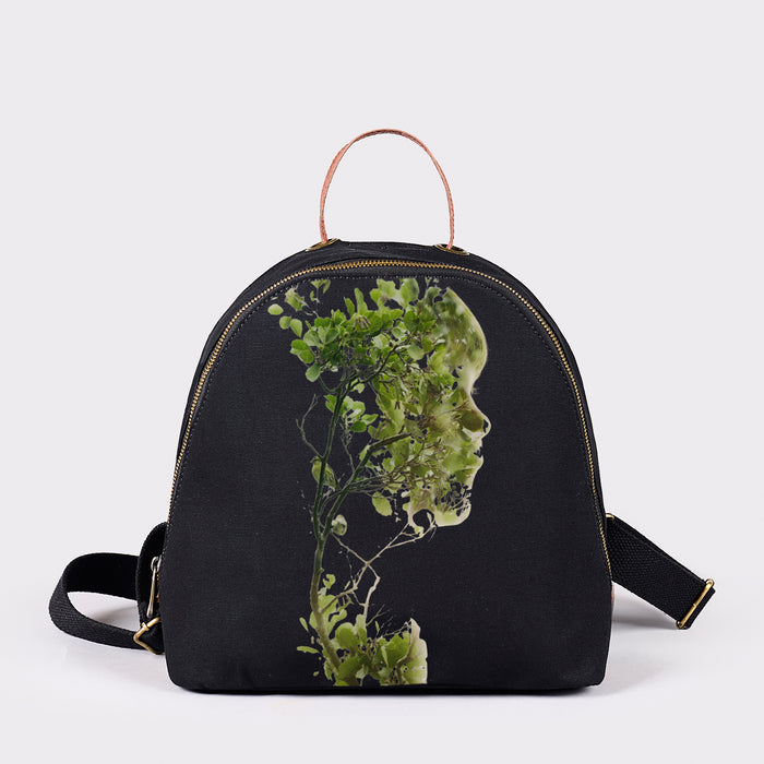 A mini backpack made from 100% cotton canvas with coconut-based leather trim. Inside, one zipped pocket for what stays safe, one open for what stays close. Compact in form, deliberate in function.