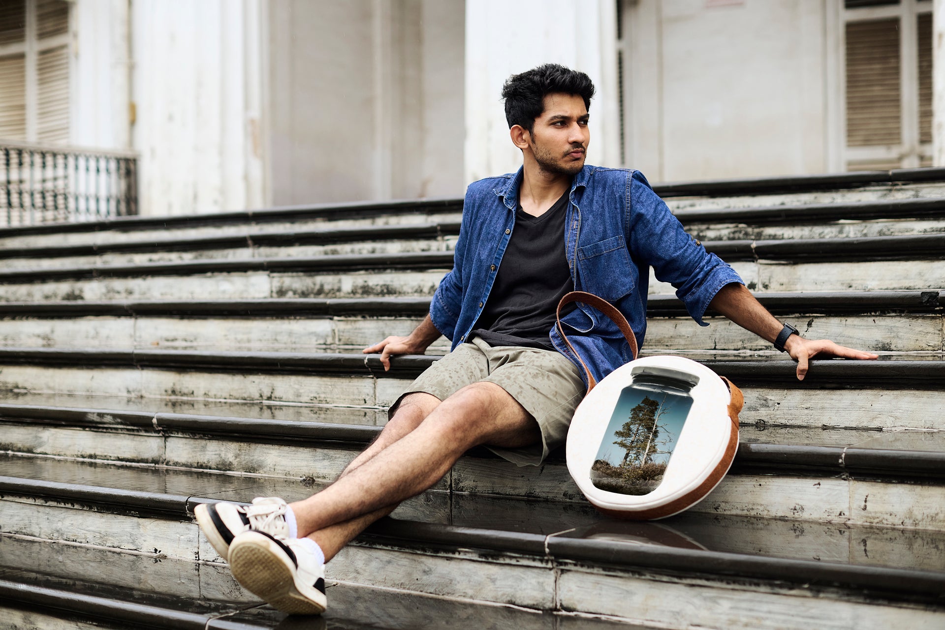 Orb is circular, sculptural, unapologetically present. 15-inch diameter in 100% cotton canvas, finished with coconut-based leather trim and handle. Inside, a zipped pocket keeps order; outside, an open pocket keeps what you need within reach. Built to be seen, built to move.
