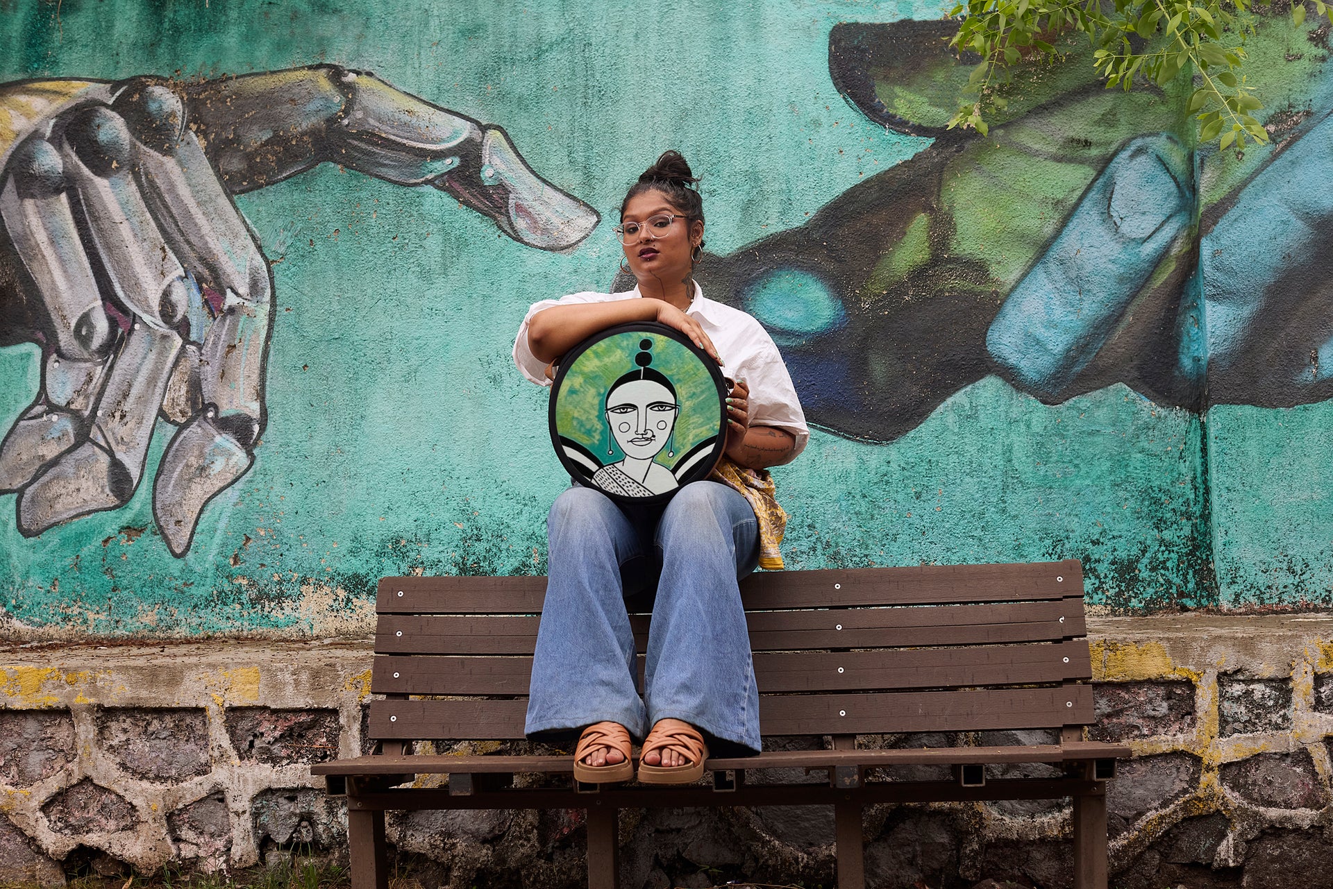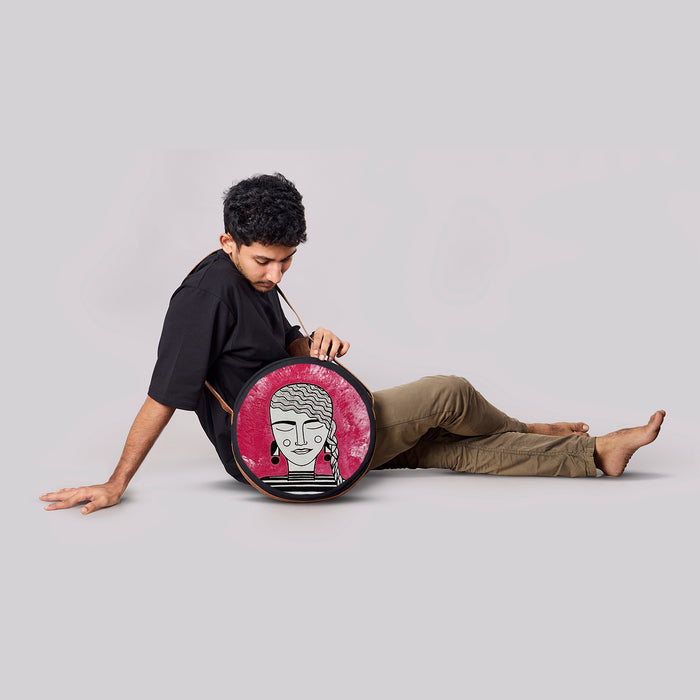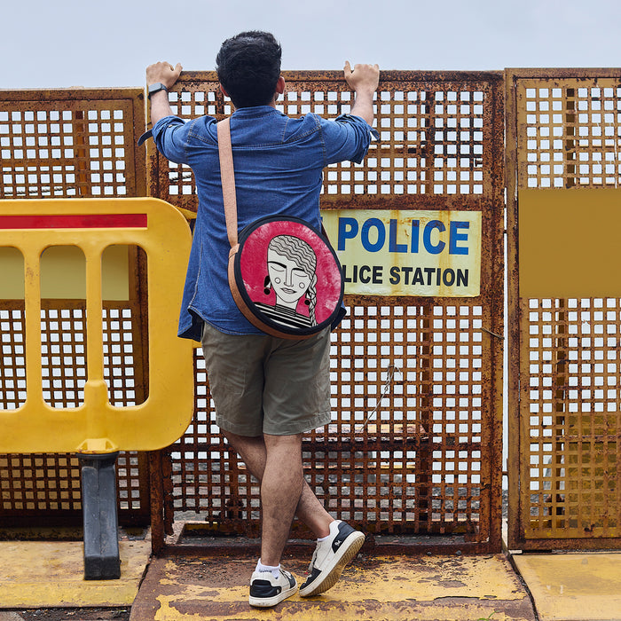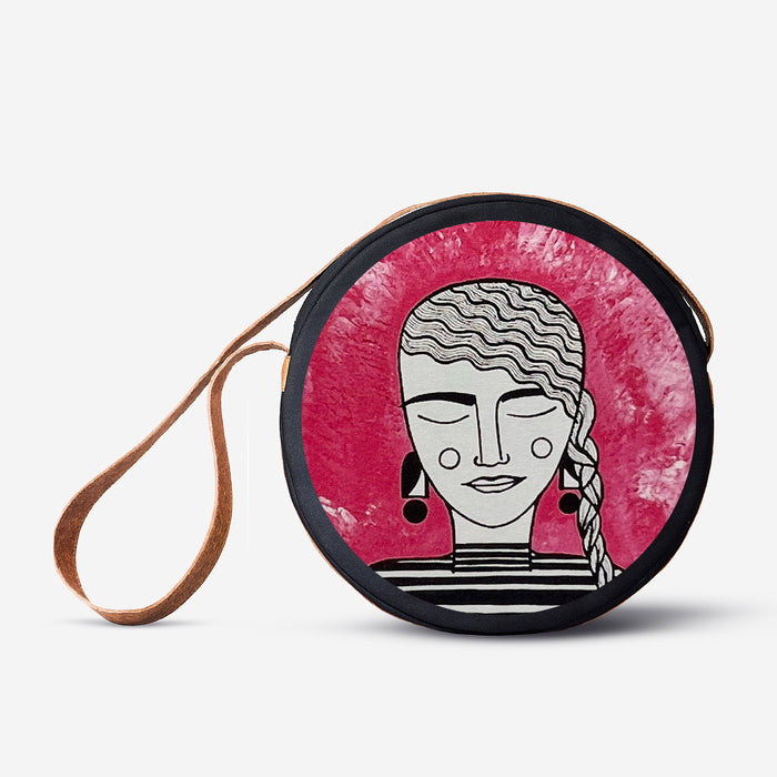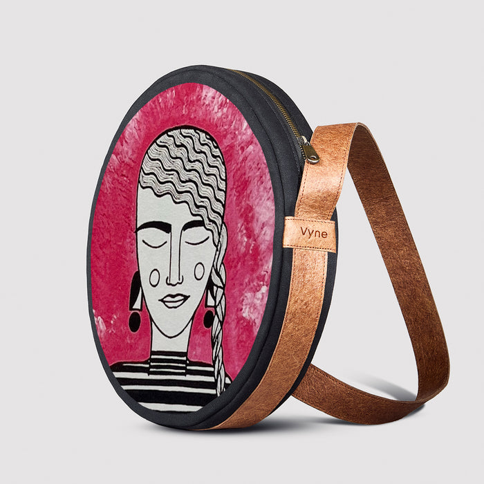 Orb is circular, sculptural, unapologetically present. 15-inch diameter in 100% cotton canvas, finished with coconut-based leather trim and handle. Inside, a zipped pocket keeps order; outside, an open pocket keeps what you need within reach. Built to be seen, built to move.