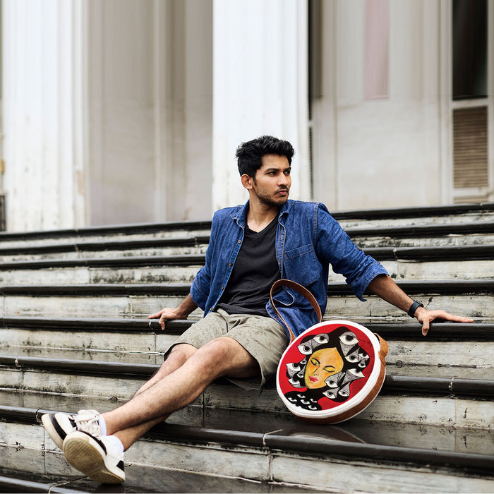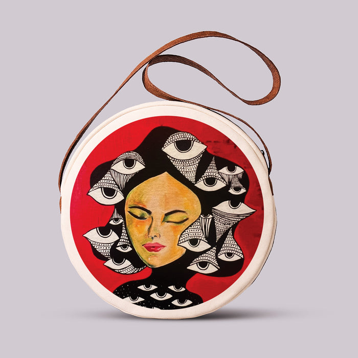 15-inch diameter in 100% cotton canvas, finished with coconut-based leather trim and handle. Inside, a zipped pocket keeps order; outside, an open pocket keeps what you need within reach. Built to be seen, built to move.