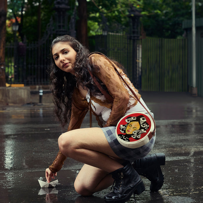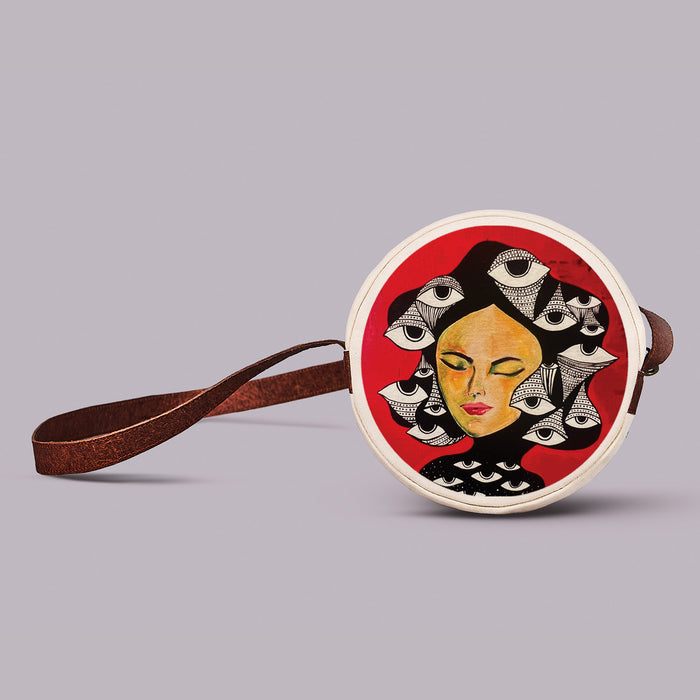 Pulse is presence you hold onto. A round 8-inch purse in 100% cotton canvas with cotton lining, finished with coconut-based leather trim and strap. One pocket to hold close, one to keep at hand. Compact expression, designed to be felt.