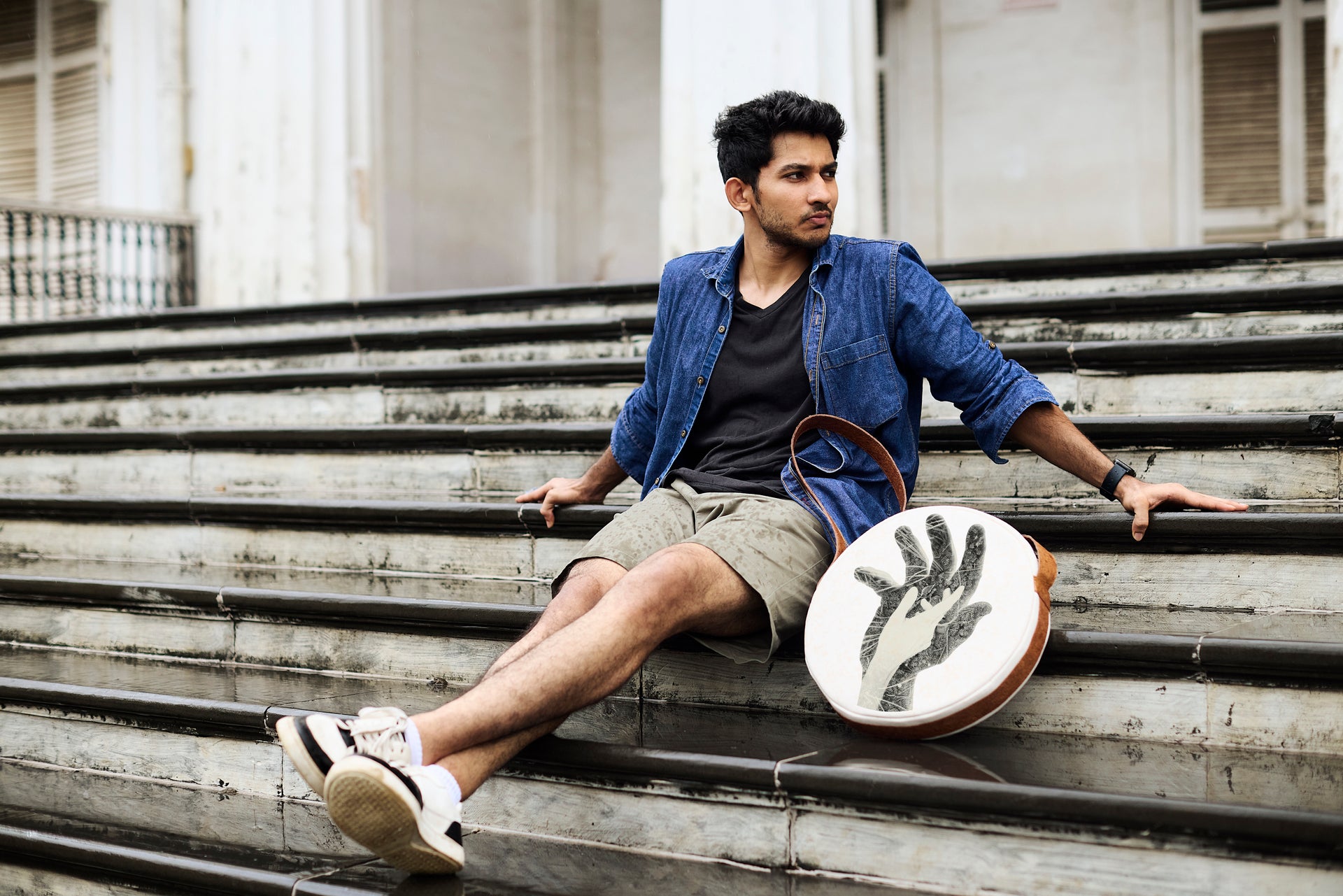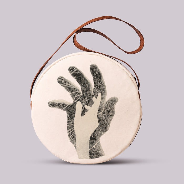 Orb is circular, sculptural, unapologetically present. 15-inch diameter in 100% cotton canvas, finished with coconut-based leather trim and handle. Inside, a zipped pocket keeps order; outside, an open pocket keeps what you need within reach. Built to be seen, built to move.