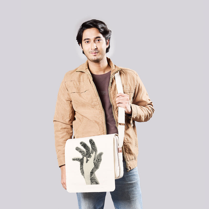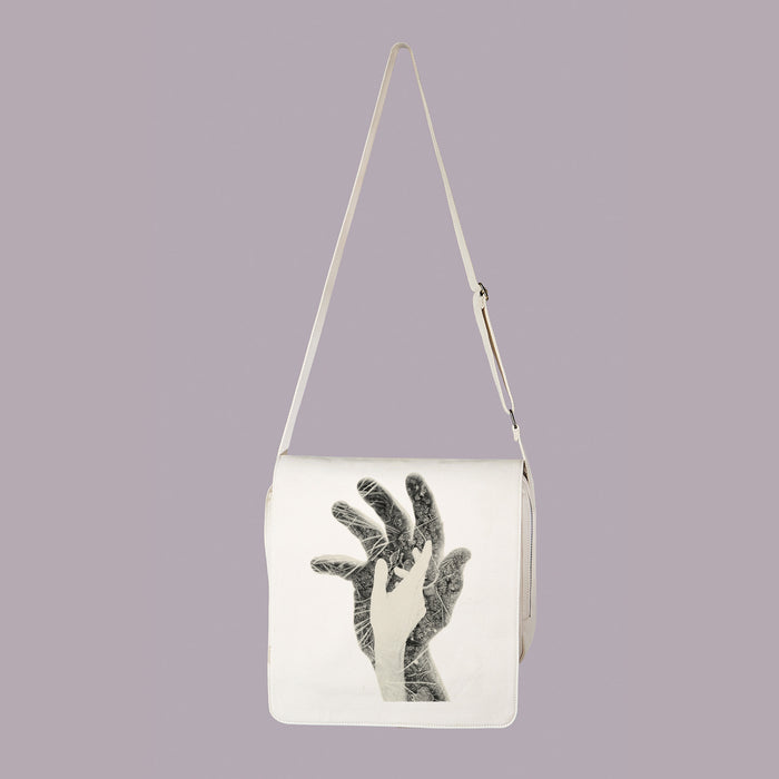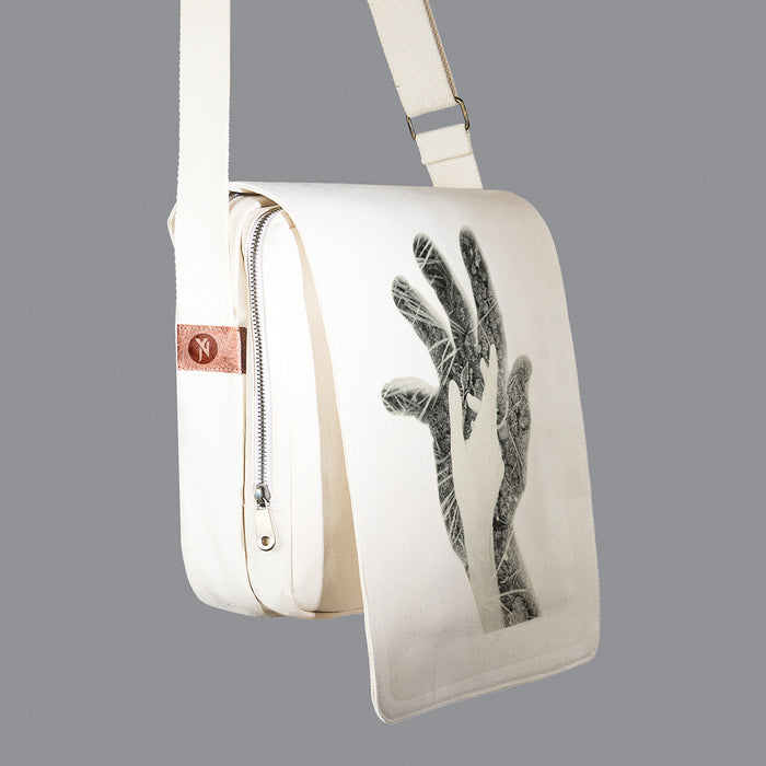 A satchel made from 100% cotton canvas with coconut-based leather trim. Two main compartments, with a zipped pocket inside, keep order, while adjustable straps add range and ease. Sized to hold up to a 13-inch laptop. Distinct, deliberate, never background.