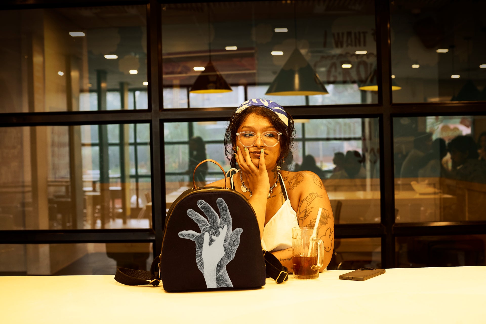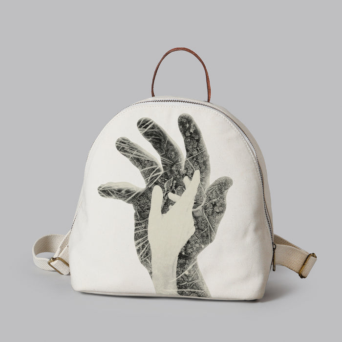 A mini backpack made from 100% cotton canvas with coconut-based leather trim. Inside, one zipped pocket for what stays safe, one open for what stays close. Compact in form, deliberate in function.
