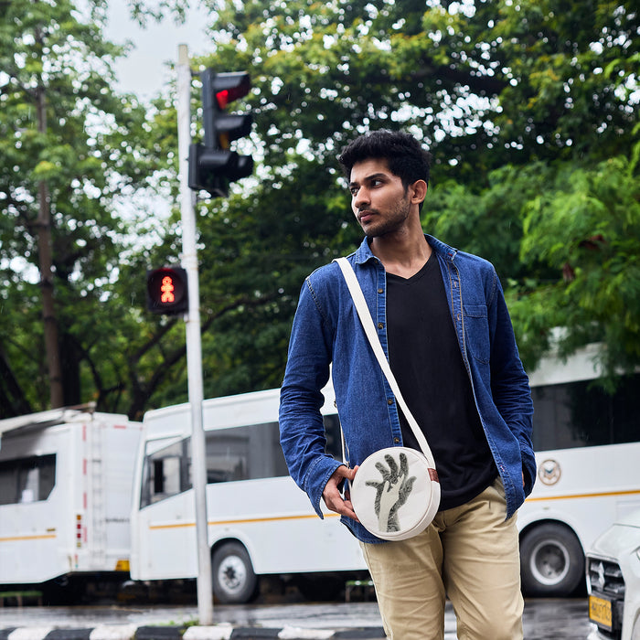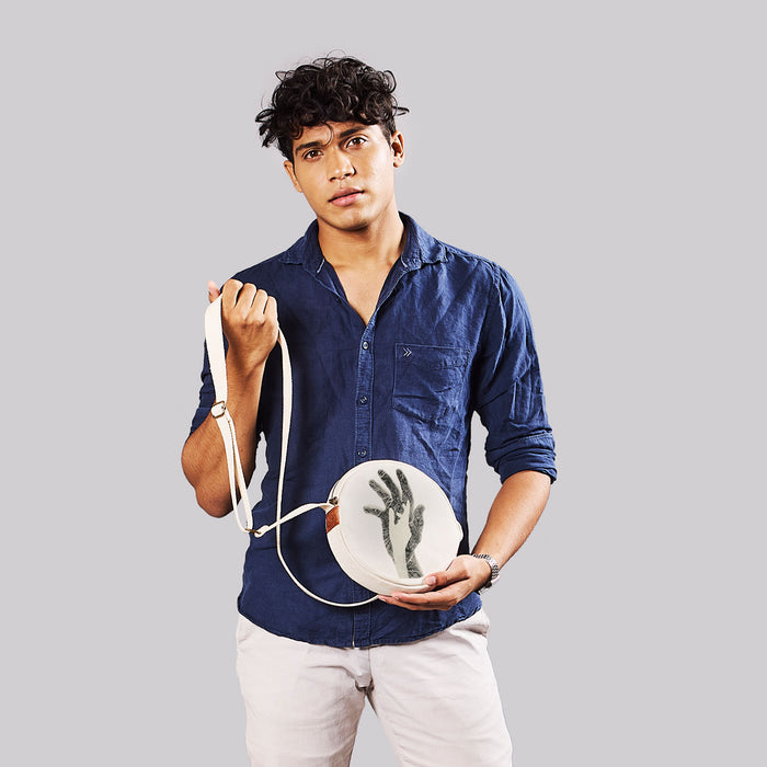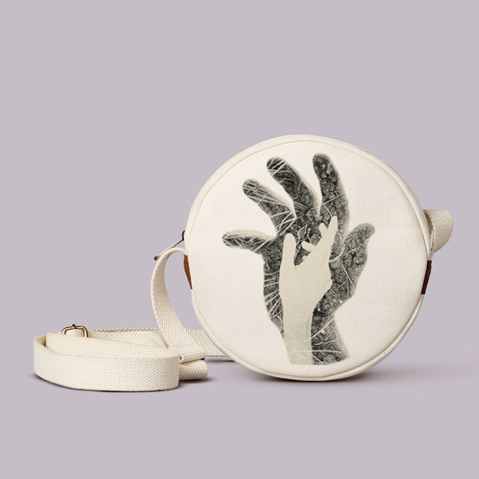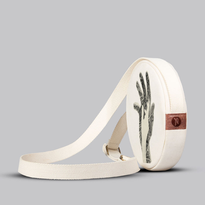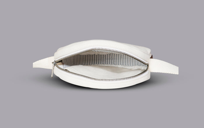 An 8-inch sling in 100% cotton canvas with cotton lining. Inside, a pocket for what matters; outside, one for what’s within reach. Carries only what counts.