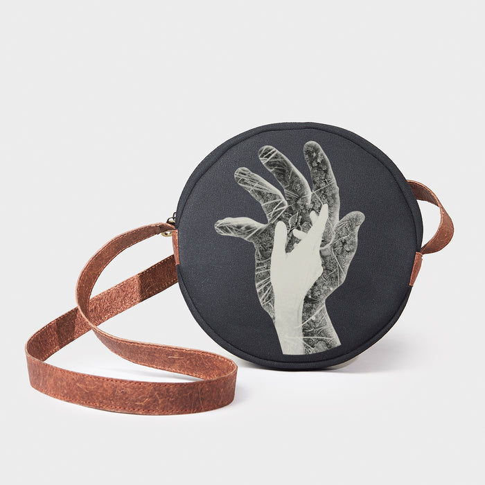 Pulse is presence you hold onto. A round 8-inch purse in 100% cotton canvas with cotton lining, finished with coconut-based leather trim and strap. One pocket to hold close, one to keep at hand. Compact expression, designed to be felt.