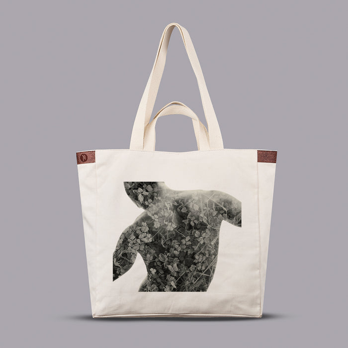 A large tote in 100% cotton canvas with coconut-based leather trim and cotton fabric lining. The main compartment secures with a magnet lock; inside, a zipped section keeps order with two open pockets stitched onto it. Structured yet fluid, Drift contains your chaos with intent.