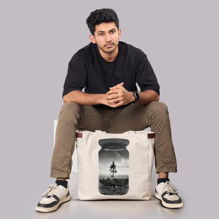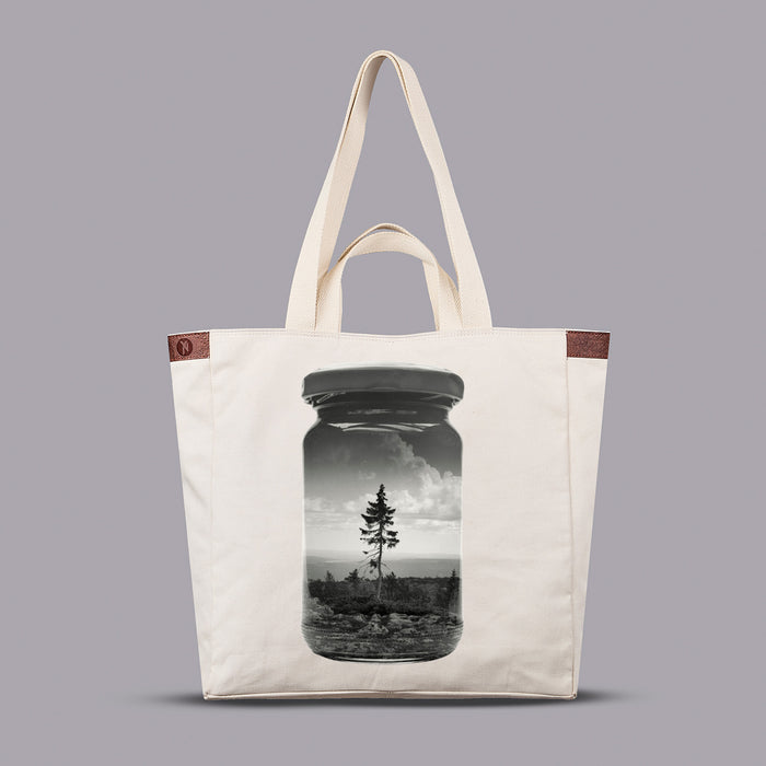This piece holds the venerable Old Tjikko inside a mason jar. I shot the jar and tree separately on film and layered them in?camera using analog double exposure. The monochrome palette adds a muted, dreamlike mood—my way of preserving an ancient tree in glass.