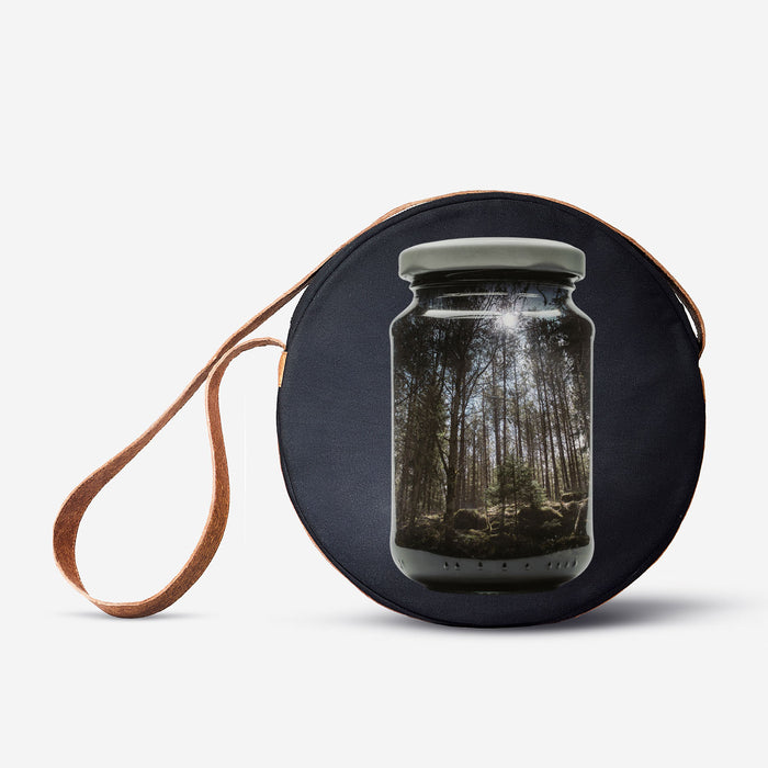 Orb is circular, sculptural, unapologetically present. 15-inch diameter in 100% cotton canvas, finished with coconut-based leather trim and handle. Inside, a zipped pocket keeps order; outside, an open pocket keeps what you need within reach. Built to be seen, built to move.