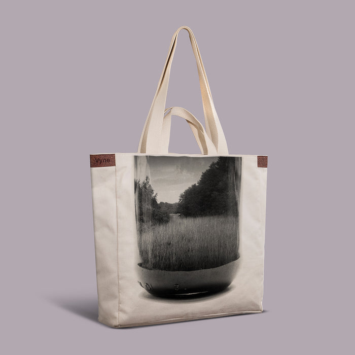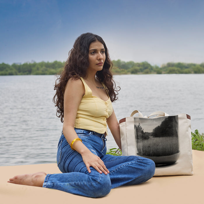 A large tote in 100% cotton canvas with coconut-based leather trim and cotton fabric lining. The main compartment secures with a magnet lock; inside, a zipped section keeps order with two open pockets stitched onto it. Structured yet fluid, Drift contains your chaos with intent.