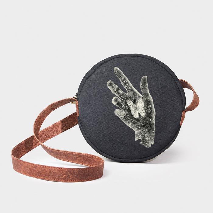 Pulse is presence you hold onto. A round 8-inch purse in 100% cotton canvas with cotton lining, finished with coconut-based leather trim and strap. One pocket to hold close, one to keep at hand. Compact expression, designed to be felt.