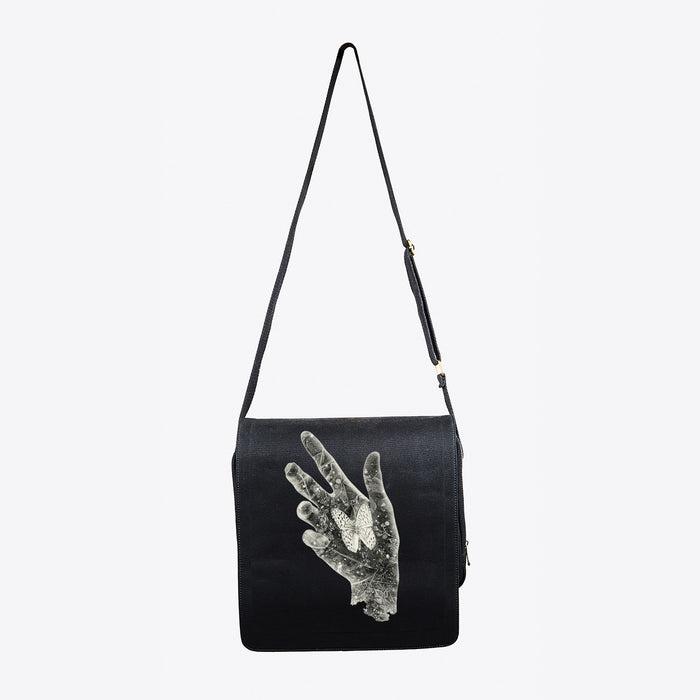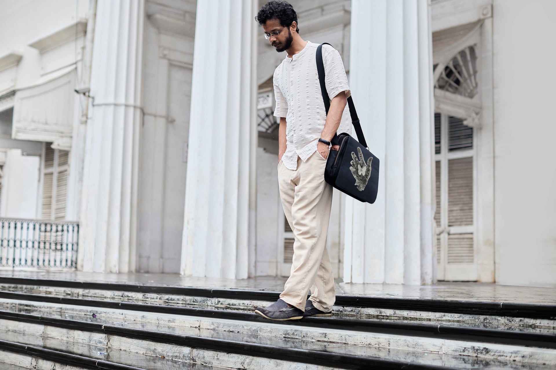Scrol folds like a message and carries like intent. A satchel made from 100% cotton canvas with coconut-based leather trim. Two main compartments, with a zipped pocket inside, keep order, while adjustable straps add range and ease. Sized to hold up to a 13-inch laptop. Distinct, deliberate, never background.