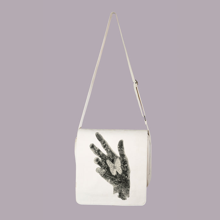 A satchel made from 100% cotton canvas with coconut-based leather trim. Two main compartments, with a zipped pocket inside, keep order, while adjustable straps add range and ease. Sized to hold up to a 13-inch laptop. Distinct, deliberate, never background.