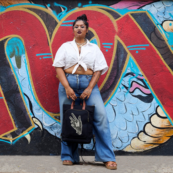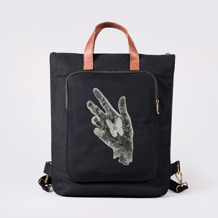 Havn is your grounded carry. Steady, functional, built with intent. A large backpack in 100% cotton canvas with coconut-based leather trim and handle. Fits a 15-inch laptop in its padded section, with an extra zipped pocket for order. A zipped exterior pocket keeps essentials close, while a magnet-locked cover at the back conceals the straps. Strong, structured, ready to move with you.