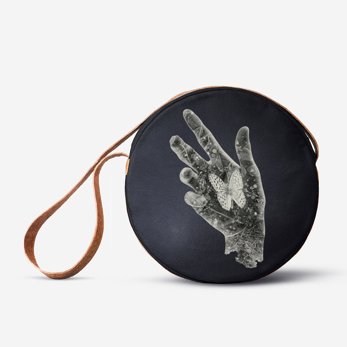 Orb is circular, sculptural, unapologetically present. 15-inch diameter in 100% cotton canvas, finished with coconut-based leather trim and handle. Inside, a zipped pocket keeps order; outside, an open pocket keeps what you need within reach. Built to be seen, built to move.